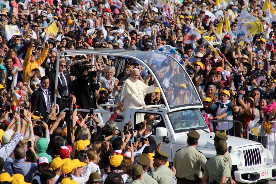 Ante una multitud de alrededor de 400 mil personas, el Papa Francisco presidió la Eucaristía por la Paz en el Parque O’Higgins, luego de haber ingresado en papamóvil al recinto, donde recibió una cálida bienvenida de los fieles, que lo aplaudieron y vitorearon con mucha alegría. En su homilía predicó sobre la Bienaventuranzas haciendo un llamado a sembrar la paz y a construir un nuevo Chile.
